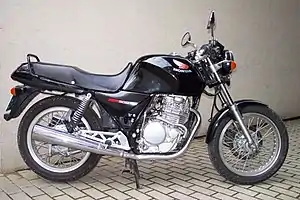 The Honda XBR 500 is a 500cc Japanese sports motorcycle launched by Honda in 1985 and in response to the Yamaha SR500. It is powered by a single-cylinder four-valve engine with the valves arranged radially relative to the geometric centre of the hemispherical combustion chamber - (Honda's Radial Four Valve Combustion Chamber, or RFVC) and actuated via intermediate sub-rockers. Displacing 498 cc (30.4 cu in) and producing 27 or 44 hp (depending upon specific market legislation), the engine, having its origins in the Honda XR series off-road models, features a "quasi-dry sump", the bulk of the oil being stored in a separate tank below the seat but a proportion (ca. 0,5 litres) of the lubricant remaining in the crankcase sump. The steel-braided hoses connecting the oil tank to the engine (clearly visible at the right-hand side of the motorcycle) are a strong visual element.