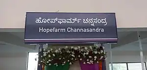 Hopefarm Channasandra (formerly known as Channasandra) is a metro station on the east-west corridor of the Purple Line of Namma Metro. This station serves the Channasandra neighbourhood area. Around this station, holds the Kadugodi metro depot followed by some locations like Prestige Park View apartment, few shopping centres and many more.[1][2][3]