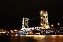 The Portage Lift Bridge connects Hancock and Houghton, Michigan, by crossing over Portage Lake, which is part of the river and canal system that crosses the entire peninsula. The Portage Lift Bridge is the world's heaviest and widest double-decked vertical lift bridge. Its center span "lifts" to provide 100 feet (30 m) of clearance for ships. Since rail traffic was discontinued in the Keweenaw, the lower deck is used to accommodate snowmobile traffic in the winter. This is the only land based link between the north and south section of the Keweenaw peninsula, and is crucial.[25]