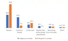 In one such report released by the National Australia Bank in partnership with the University of New South Wales, researchers found significant economic inequality between Indigenous and non-Indigenous people in Australia.[7] This is evidenced by a survey showing that only 1 in 10 Indigenous Australians are financially secure and almost half (48.8%) as experiencing severe or high financial stress.[7] This is in comparison to only 11% of the general population experiencing the same severe or high financial stress.[7] Thus, Indigenous people are represented in much higher proportions within Australians dealing with financial stress and insecurity.