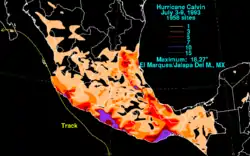 Due to the storm's large size, Hurricane Calvin was responsible for heavy flooding along much of the coast of Mexico, and after moving onshore as a hurricane, two locations (El Marques, Japala Del) reported as high as 18.27 in (464 mm) of rain.[18] The flooding led to mudslides, killing 28 people on land, with 30,000 people displaced.[19] Most of the casualties were indirect.[20] In all, 37 people perished due to Hurricane Calvin.[21] Nationwide 42,063 people were evacuated from their homes.[22] Numerous seaside restaurants were washed off their respective foundations.[23] Banana, mango, and corn plantations were also destroyed by the strong winds.[24] Coconut trees were reportedly brought down as well.[25]