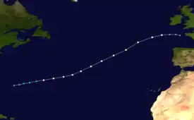 Steered generally eastward by a deep surface low in the westerlies, Fran accelerated towards the Azores Islands.[2] The storm traveled at a rapid pace of 30 to 35 mph (48 to 56 km/h) but continued to organize.[7] By October 11, the hurricane began to undergo an extratropical transition as it continued to move unusually fast towards the northeast.[8] Around this time, Fran attained its peak winds of 80 mph (130 km/h).[4] Shortly after bypassing the Azores islands on October 12, the system moved over an area with sea surface temperatures around 60 °F (16 °C), well below what is required for tropical cyclone development.[9] Later that day, the central pressure of Fran decreased to 978 mbar (hPa; 28.88 inHg), the lowest recorded in relation to the hurricane. Shortly after reaching this intensity, the hurricane transitioned into an extratropical cyclone and quickly merged with a cold front off the coast of France.[2]