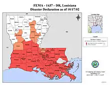 President Bush declared Louisiana a federal disaster area after the storm, making it eligible for assistance.[52] FEMA set up three locations to apply in Mississippi and Louisiana. Applications began pouring in, 153,000 by the time of the deadline.[53][54] Over $311 million in aid was granted to Louisiana.[55] A total of $50 million of that money was in the form of low interest loans, and not actual grants.