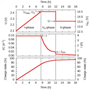IUoU is a DIN-designation[1] (DIN 41773) for a lead-acid battery charging procedure that is also known as 3-stage charging, 3-phase charging, or 3-step charging. It consists of three phases (or stages), to be executed by a battery charger. The three phases are: I-phase (constant electric current), Uo-phase (constant over-voltage), and U-phase (constant voltage). The purpose is to fully charge the battery in a relatively short time without reducing its life span and to keep the battery charged indefinitely as long as the charger is connected.
