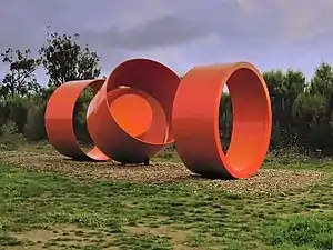 This work was installed in 1980, on a small lawn outside the Union Building at the heart of the University of Melbourne.[51] It is formed from 19mm steel, and consists of two upright steel circles, each 360 cm in diameter, and three folded metal planes; the total length is 6 metres.[52] It provides the students with a unique resting place among its massive unfurling bands and is the focal point of one of the university's busiest outdoor spaces, the Union Lawn.[53] see more images
