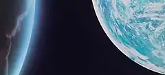 The first and second encounters of humanity with the monolith have visual elements in common; both apes, and later astronauts, touch the monolith gingerly with their hands, and both sequences conclude with near-identical images of the Sun appearing directly over the monolith (the first with a crescent moon adjacent to it in the sky, the second with a near-identical crescent Earth in the same position), both echoing the Sun–Earth–Moon alignment seen at the very beginning of the film.[35] The second encounter also suggests the triggering of the monolith's radio signal to Jupiter by the presence of humans,[36] echoing the premise of Clarke's source story "The Sentinel".
