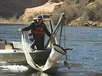 Drift can service freshwater invertebrates by giving them an escape route from predation, or the use of a current to disperse progeny downstream.[2] On occasion, however, invertebrates will inadvertently lose their footing, and drift downstream. For that, invertebrates counter a stream's flow through physical and behavioral adaptations.[3] And just as invertebrates adapted to stabilize themselves in the water column, or use the stream's energy to their advantage, so too have predators adapted to catch invertebrates as they drift. Species of fish, commonly salmonids, catch drifting insects during the peak times after dusk, and before dawn.[4] Fishermen can exploit this relationship using fly fishing techniques and lures that mimic drifting insects to catch these fishes.[5]