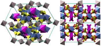 Iron sulfates occur as a variety of rare (commercially unimportant) minerals. Mikasaite, a mixed iron-aluminium sulfate of chemical formula (Fe3+, Al3+)2(SO4)3[6] is the name of mineralogical form of iron(III) sulfate. This anhydrous form occurs very rarely and is connected with coal fires. The hydrates are more common, with coquimbite[7] (nonahydrate) as probably the most often met among them. Paracoquimbite is the other, rarely encountered natural nonahydrate. Kornelite (heptahydrate) and quenstedtite (decahydrate) are rarely found. Andradite garnet is a yellow-green example found in Italy.[8] Lausenite (hexa- or pentahydrate) is a doubtful species. All the mentioned natural hydrates are unstable connected with the weathering (aerobic oxidation) of Fe-bearing primary minerals (mainly pyrite and marcasite).