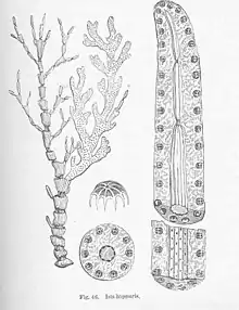 Isis hippuris, also known as sea bamboo, is a species of bamboo coral found in the Western Pacific Ocean, commonly near the coasts of Indonesia.[1] I. hippuris reproduce asexually, and is abundant throughout its habitats in Indonesia. For centuries, I. hippuris has been identified by its bamboo or bony-looking structure. Additionally, it is notable for producing Hippuristanol, a molecule that could potentially have anti-cancer applications. While no actual conclusion regarding Hippuristanol in I. hippuris has been published, scientists and marine biologists continue to study how the molecule could be used in cancer research and recovery.[2] Although only found in the Western Pacific Ocean, I. hippurisis highly sought after across the globe, and is seen as a symbol of beauty.[3]