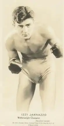 Isadoro Anthony "Izzy" Jannazzo (January 31, 1915 – June 18, 1995) was an American professional boxer who challenged Barney Ross for the NYSAC, NBA, and The Ring magazine world welterweight championship in November 1936, and took the Maryland version of the World Welterweight Championship in October 1940. In 1937, he fought national welterweight champions before large crowds in Australia and Germany. In 1940, he was listed as the world's top welterweight contender by some sources.[1] His managers were Guy Anselmi and Chris Dundee.[2][3]