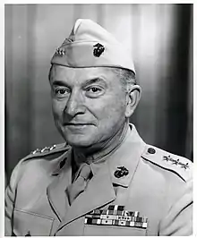 In November, he returned to the United States,[36] and was assigned to Marine Barracks, Washington, D.C., again under William Rupertus until June 1940. In March 1940, he became a company commander in the Marine Guard detachment at President Franklin D. Roosevelt's personal retreat at Warm Springs, Georgia, under the command of LtCol Charles T. Brooks, and became close to the president during an extended retreat.[37] At one point, the guards performed silent exhibition drill for the president and patients [38] at the Roosevelt Warm Springs Institute for Rehabilitation.