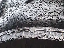 Keys, a nine-foot bronze bust that portrays Benjamin Franklin turning to greet a visitor, sits at the front of Girard Fountain Park in the Old City neighborhood of Philadelphia, Pennsylvania. The sculpture was commissioned in 2003 by the city's arts agency and was unveiled and dedicated on October 5, 2007.[3] It replaced Penny Franklin, an acrylic sculpture by Reginald E. Beauchamp that was covered with 80,000 pennies collected from local schoolchildren, and which had deteriorated and been removed.[4] Peniston won the commission with a proposal that echoed the spirit of the older work. Over two years, the sculptor visited two dozen Philadelphia elementary schools, where he talked about Franklin's activities as a community-builder. He also asked the students to bring in a spare key to be worked into the sculpture, and ultimately collected more than 1,000 keys. "The keys, worked into the statue's surface, are meant to represent the role of community organizers, donors and volunteers in making projects around the city possible," wrote one local newspaper.[5] Even more students became involved through a penny drive mounted by the Philadelphia Fire Department, which collected some 1.8 million pennies in 500 local schools to help fund the casting. The firefighters also added their own touch to the sculpture: When the molten bronze was poured for the work, they cast in brass nameplates representing fallen colleagues from four centuries of service.[6]
