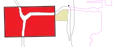 Thompson's survey of Chicago was bounded by Kinzie Street, Madison Street, State Street, and Desplaines Street,[lower-alpha 1] an area of about 0.375 square miles (0.97 km2).[7] It did not extend to Lake Michigan because Fort Dearborn, which had been built by the United States government in 1803, occupied land on the lakeshore.[2] The plat area was divided into 58 blocks, which were assigned numbers from northeast to southeast in a boustrophedon order, and contained streets 66 feet (20 m) wide and alleys 16 feet (4.9 m) wide.[6] The pioneer Mark Beaubien's cabin ended up in the middle of one of the streets; he bought two lots of the plat and moved his property by a couple of yards.[4]