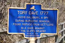 It was here that in 1777, at a spot known as Tory Cave, Jacob Salsbury found refuge from settlers during the Burgoyne Invasion.