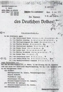 John Graudenz was arrested on 12 September 1942 and sentenced to death by the Reichskriegsgericht on 19 December 1942. Without the verdict gaining legal force under the Nazi laws, he was hanged on 22 December 1942 in the Plötzensee Prison on the orders of Adolf Hitler.[15] Even before the beginning of the oral proceedings of Reichskriegsgericht, the Oberkommando der Wehrmacht i.e. the High Command of the Wehrmacht, ordered strangulation. This was against all the traditions and regulations of the Prussian-German military and civil courts as a method of execution [...] strangulation.[16]