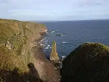 After Helmsdale, the scenery along the cliffs, at several ruins of old fishing stations, at small harbours, and at several sea stacks and arches is spectacular, culminating in the distinctive Stacks of Duncansby. After Helmsdale the trail crosses the Ord of Caithness and goes past Badbea Clearance Village on the way to Berriedale. The next town is Dunbeath and then Lybster. After that, it reaches Whaligoe where the famous Whaligoe Steps descend to an old fishing harbour. After that, the trail goes past one of the highest sea arches on the British coast on the way to Wick. After Wick it passes the lighthouse at Noss Head, goes past Castle Sinclair Girnigoe, and rounds Sinclairs Bay. It then goes through the village of Keiss and then the final stage takes the walker past Duncansby Head and finally on to John o' Groats.