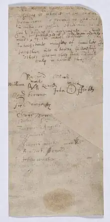 We whose names are hereunder, desirous to inhabit in the town of Providence, do promise to subject ourselves in active and passive obedience to all such orders or agreements as shall be made for the public good of the body in an orderly way, by the major consent of present inhabitants, masters of families, incorporated together in a Towne fellowship, and others whom they shall admit unto them only in civil things.[16]