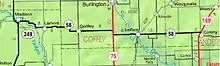 K-58 is a 46.761-mile-long (75.255 km) east–west state highway in the U.S. state of Kansas. K-58's western terminus is at K-99 west of Madison. It runs east through Lamont and Gridley and after a short concurrency with US-75, it goes through LeRoy before ending at the eastern terminus at U.S. Route 169 (US-169) near Colony. It is one of the newer state highways in Kansas formed on September 20, 2004, when K-57 was truncated at K-4 in Dwight. The route changes were made because of K-57's long concurrencies with K-4, K-177, US-50 and K-99.