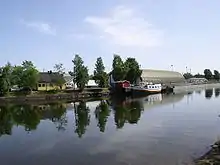 The peninsula is located slightly south of the town of Sandvika, at the outlet of the river Sandvikselva, at the opposite shore of Kjørbo.[1] To the south lies the island of Kalvøya, to which Kadettangen is connected to with a suspension bridge.[2] The southern end of Kadettangen is now used for leisure purposes, with its beach and beach volleyball facilities.[3] Because of its low altitude and consequent problems with flooding, the peninsula was reinforced with fill dirt.[4] The practice of filling around Kadettangen continues to this day, with proposals to increase the land area with leftover material from the excavation of the Løkkeås Tunnel as a part of Norwegian National Road 164.[5][6]