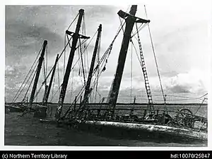After being requisitioned by the RAN, she was towed from Fremantle to Darwin fully laden with coal in February 1942. She sank at her mooring several days after arriving in Darwin after being machine gunned and badly damaged during the Japanese air raid on Darwin on 19 February 1942. The sinking may have been by neglect as in the confusion after the raids it is possible no one remembered to continue to run her pumps to keep her afloat.[4] Her wreck is located at 12°02′00″S 130°05′00″E.