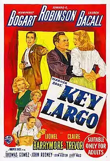 Key Largo is a 1948 American film noir crime drama directed by John Huston and starring Humphrey Bogart, Edward G. Robinson and Lauren Bacall. The supporting cast features Lionel Barrymore and Claire Trevor.[3][4] The film was adapted by Richard Brooks and Huston from Maxwell Anderson's 1939 play of the same name.[5] Key Largo was the fourth and final film pairing of actors Bogart and Bacall, after To Have and Have Not (1944), The Big Sleep (1946), and Dark Passage (1947). Claire Trevor won the 1948 Best Supporting Actress Academy Award for her portrayal of alcoholic former nightclub singer Gaye Dawn.