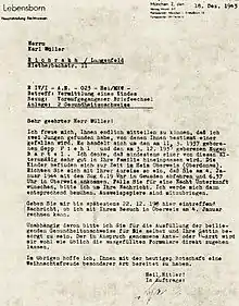 ![]() Letter from Lebensborn office to Reichsdeutsche family of Herr Müller in Germany informing that two perfect boys have been found for them to choose one they like. The boys' names have already been Germanized, 18 December 1943 | |