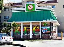 Originally KFC kept the traditional red roof, as seen in South Park, until YUM Corporation threatened to file a lawsuit against the KFC owners, citing trademark infringement against the Colonel's famous red mansard roof. YUM agreed to paint the roof green for the owners in 2010. Scrap metal from the original Kentucky Fried Chicken oven ranges was used to create the interior designs inside the showroom. The original floor, counters and food refrigerators also remain to keep the originality and humor intact.[1] LA Weekly called the owners' marketing a "genius" strategy and KFC won "The Best Re-Appropriation of a Fast Food Restaurant Award" in LA Weekly's "Best Of 2009" Publication.[2] A northern California marijuana dispensary tried to copy the KFC marketing strategy in August of 2010 by donning the same acronym and trying to lease a KFC in the state of Maine, but it was denied.[3]
