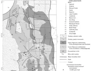 Ore deposits occurred mainly along major fault fissure veins. These faults may represent the outer margin of the Emory Caldera. Most mineralization occurred in the Late Oligocene.[8]