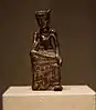 The stylistic similarities of this Buddha to those found in China lead most scholars to conclude that the image is an import.[10] The possibility remains that the image is a Korean copy of a Chinese prototype.[14] One reason to argue for a Korean provenance is the fact that the rectangular base of the Ttukseom Buddha is solid while Chinese examples are hollow, perhaps indicating a still developing sculpture casting tradition in early Korea. The discovery of the Ttukseom Buddha near the proposed site of Baekje's first capital and major citadel suggests the figure may be an example of Baekje sculpture. A very similar meditating Buddha discovered in the later Baekje capital of Sabi (now known as Buyeo) supports this theory, indicating these first images of Buddha were influential many years after their introduction or had been preserved to be transferred to a new capital.[15] Other scholars suggest that the Ttukseom figure may be a Goguryeo piece because of the close stylistic similarities the figure has with the northern dynastic art, a typical feature of early Goguryeo sculpture.[13]