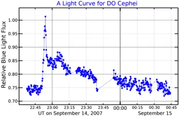The larger, primary star is designated component A, while the secondary, smaller star is labeled component B. Component A has about 27% of the Sun's mass and 35% of the Sun's radius. Component B has about 18% of the Sun's mass and 24% of the Sun's radius.[6][7] Component B is a flare star and has been given the variable star designation "DO Cephei".[11] It is an irregular flare that typically doubles in brightness and then returns to normal over an 8-minute period.
