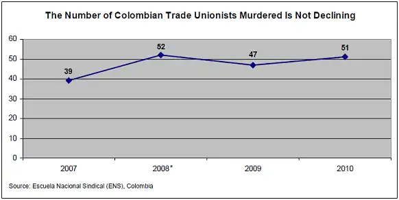 Colombia is widely referred to as the most dangerous country in the world to be a trade unionist.[31][32][33] The 2011 Annual Survey of Violation of Trade Union Rights published by the International Trade Union Confederation (ITUC) reports that 49 trade unionists were killed in Colombia in 2010, more than in the rest of the world put together.[31] According to government figures, 37 unionists were murdered.[34] Between January and August 2011, 19 trade unionists have been reported killed.[35]