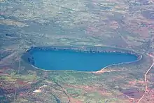 Lake Chala, also known as Lake Challa, is a crater lake[4] that straddles the border between Kenya and Tanzania. The lake formed approximately 250,000 years ago.[5] The lake is east of Mount Kilimanjaro, 8 kilometres (5.0 mi) north of Taveta, Kenya, and 55 kilometres (34 mi) east of Rombo District. The lake is surrounded by a steep crater rim with a maximum height of 170 metres (560 ft).[3]