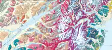 Lake Clark preserves a wide variety of Alaskan landscapes and ecosystems, corresponding to its four main physiographic areas. The coastal sections running along the Cook Inlet from Tuxedni Bay to Chinitna Bay include coastline and marine ecosystems. The mountains of the Alaska, Aleutian and Chigmit Ranges with their glaciers form a second region. On either side of the mountains the valley, lake and foothill areas present a glacially altered landscape.[27] Boreal forest dominates the lower sections of the southwest part of the park, with white and black spruce making up most of the coniferous trees. White spruce have been affected by spruce bark beetle infestation, and spruce needle rust outbreaks have been so heavy that the surface of Lake Clark has been colored orange by spores.[28] Farther north and west lie the tundra regions,[7] primarily the result of elevation. The tundra supports caribou and ptarmigans.[29]