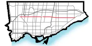 East of Victoria Park Avenue the road was also referred to as 1st Concession Road based on the original survey of the old Township of Scarborough (the line between Concession D and Concession 1).[6] In sections west of Yonge Street the route for the current road would have been the Fourth Concession with Eglinton Avenue as Line between Third and Fourth Concession and St. Clair Avenue as the Third Concession.
