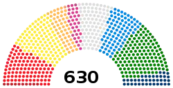 The number of elected deputies is 630. However, due to resignations, deaths or office incompatibilities, the number of deputies might be lower during the periods in which substitutes are picked (via parties lists or via by-elections).