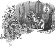 The simpler version of the legend is found in the Libro Velho. In it the Muslim king Abencadão kidnaps Ramiro's queen and carries her off to his castle at Gaia. Ramiro mounts a naval expedition down the Douro to rescue her. Rather than attack directly, however, he leaves his son Ordoño (the future Ordoño III) and his vassals at a distance and approaches the castle alone disguised as a beggar. Ortiga, one of the kidnapped queen's Muslim ladies-in-waiting, discovers him while fetching water and they converse in Arabic. Ortiga brings him into the castle, but the queen orders him locked in an adjacent room, intending to hand him over to her captor. Abencadão returns to the castle that evening. After supper, he has sex with the captive queen. She then reveals that her husband is in the castle, whereupon Ramiro blows the hunting horn he had brought with him to summon Ordoño and his vassals. In the ensuing battle, the Muslims are all beheaded and the castle razed.[1]