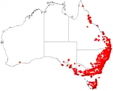 The variable swordsedge ranges widely across central and eastern New South Wales as far west as Lockhart.[2] It is a component of two riparian scrub communities in Tasmania: both are composed of ferns, sedges and heaths, one dominated by Melaleuca squarrosa and Leptospermum lanigerum, the other by Eucalyptus viminalis, E. globulus, E. obliqua and E. amygdalina with Beyeria viscosa and Exocarpos cupressiformis as understory.[5]
