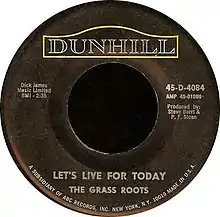 The song was popularized by the American rock band the Grass Roots,[1] who released it as a single on May 13, 1967.[3] The Grass Roots' version climbed to number 8 on the Billboard Hot 100 singles chart, eventually selling over two million copies and being awarded a gold disc.[1][4][5] The song also became the title track of the Grass Roots' second album, Let's Live for Today.[6] Since its initial release, the Grass Roots' rendition of the song has become a staple of oldies radio programming in America and is today widely regarded by critics as a 1960s classic.[2]
