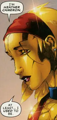 Heather and Davis Cameron were a lifeguard and a surfer, respectively, living in Surfers Paradise in Australia. Unbeknownst to them, their father is an underworld crime lord known as Viceroy, and upon his death they were attacked. Together with Storm and Neal Shaara (the new Thunderbird), they managed to defeat their attackers. Heather discovered she was a mutant with the power to manifest whatever was necessary to save the life of someone in danger around her, including her own. Her power enabled her to manifest wings, golden armor, the ability to breathe underwater, and many other less noticeable adaptations. Heather soon joined the splinter team of X-Men, and formed a romance with Thunderbird.[2]