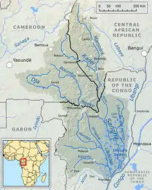 The Likouala-Mossaka is a right tributary of the Congo into which it flows at Mossaka about 650 kilometres (400 mi) from its source. Its basin adjoins that of the Sangha River to the north and the Ogooué River in Gabon to the west. To the south it adjoins the basin of the Alima, which has hardly any left tributaries.[1] The lower Sangha, the Likouala-aux-Herbes and Likouala-Mossaka rivers flow through the Congolese Cuvette, a huge depression with an equatorial climate. The soil of this region is sandy or clayey quaternary fluvial alluvia. Vegetation is dense, humid, shady forest that partly floods during the high water season.[2]