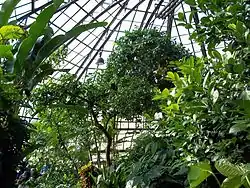 The conservatory consists of a vestibule, four display halls and fifteen propagating and growing houses. The vestibule and Palm House were built and opened to the public in 1892 and contain giant palms and rubber trees, including a 15 m (50 ft) fiddle-leaf rubber tree planted in 1891. The Palm House, has a display of more than twelve different types of palms. The most unusual palms include Dwarf Sugar, Bottle, Fiji Fan, and Everglade palms. Some of the most recognized palms include the pygmy date plan and the coconut palm due to its fruit. Furthermore, this large house also includes plants that produce food: banana plants, a grapefruit tree, orange trees, papaya plants, a coffee tree, and a cacao tree, among others.[8] The Palm House contains Garden Figure, a sculpture by Frederick Hibbard.[9] The Fern Room or Fernery, approximately five and a half feet below grade, was opened in 1895. It contains plants of the forest floor, primarily a vast collection of ferns and one of the most historical plants, the cycads. Fossils of these plants date back at least 250 million years. These plants are similar to conifers and the ginkgo tree rather than palm trees.[8] The Tropical Room was originally called the stove house. Opened in 1895, it contained an assortment of tropical plants suspended from bark-covered walls. It is now called the Orchid Room and has a collection of approximately 25,000 natural species. This room contains hundreds of orchids, bromeliads and a few tropical carnivorous plants. Orchids, just like bromeliads, get their water from the humidity in the room.[8] The Display House or The Show House is used for seasonal flower exhibits. The "Spring Flower Show" starts on January 21 and ends on May 13. Following that show is the "Tropical Summer Show" that starts on June 2 and runs through September 23rd. Finally, the year ends with the "Winter Flow and Train Show" that runs starts on November 24 and ends on January 6.[8]