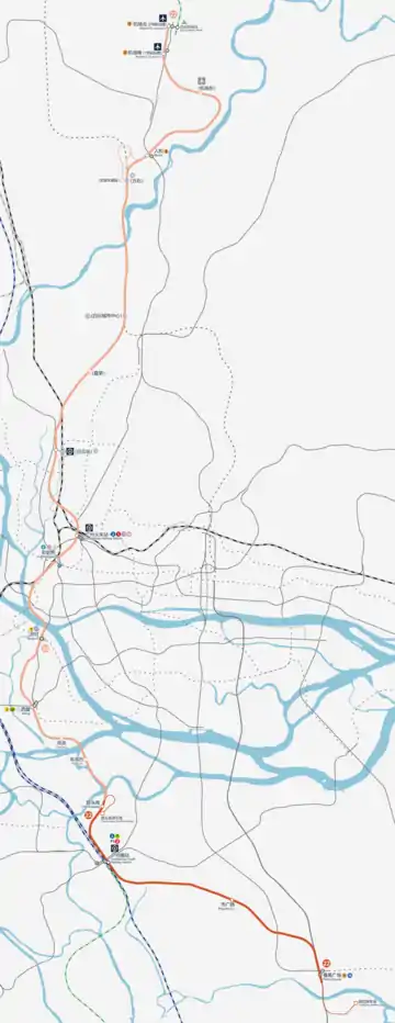 The North extension of Line 22 will be 41.1 km (25.54 mi) in length with 10 new stations and be fully underground.[10] The north extension will directly connect Guangzhou Baiyun Airport while passing through Guangzhou Railway Station and Guangzhou Baiyun Railway Station.[9] On December 31, 2021, the North Extension started construction.[11]