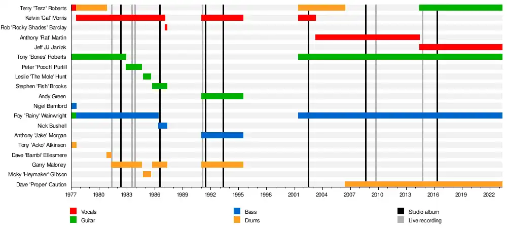 Discharge are an English hardcore punk band from Stoke-on-Trent. Formed in early 1977, the group originally featured a lineup of vocalist Terry "Tezz" Roberts, guitarists Roy "Rainy" Wainwright and Tony "Bones" Roberts, bassist Nigel Bamford and drummer Tony "Acko" Atkinson. The band's current lineup features Rainy on bass (a constant member, save for the group's 1991–99 reunion), Bones on guitar (who originally left in 1982 and rejoined in 2001), Tezz on guitar (the band's drummer from 1977 to 1980 and 2001 to 2006, before rejoining in 2014), drummer Dave "Proper Caution" Bridgwood (since 2006) and vocalist Jeff "JJ" Janiak (since 2014).