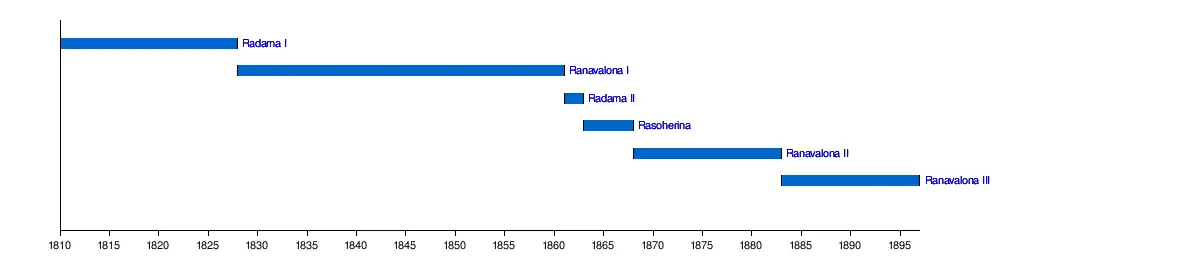 | Radama II King of Madagascar 1829–1861–1863 | Ranavalona II Queen of Madagascar 1829–1868–1883 | Rainilaiarivony Prime Minister of Madagascar 1828–1864– 1895–1896 | Ranavalona III Queen of Madagascar 1861–1883– 1897–1917 | Raharo Prime Minister of Madagascar 1824–1852– 1865–1868 | |||||||||||||||||||||||||||||||||||||