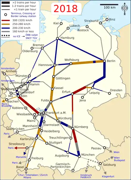 Frequency of trains and allowed max speed on the German Intercity-Express (ICE) network (2017/18)