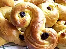 - Bolle - a small wheat bun pastry with usually a round top and flat bottom that contains wheat flour, sugar, yeast, eggs, milk, water and often also cardamom and hornsalt. Buns can be served whole or split in half with butter and toppings as a dessert, a snack or often as an accompaniment to coffee. They often contain raisins (rosinbolle) or chocolate (sjokoladebolle).[3]