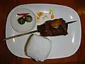 Nationwide | Philippine English term for Inihaw. Grilled or skewered meat (mainly pork or chicken) marinated in a sweet soy-garlic mixture, grilled, basted with the marinade and then served with either a soy-vinegar dip or a sweet brown sauce. Variants also use offal, such as isaw. | |