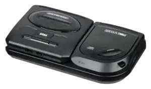 The Sega CD, originally released as the Mega-CD (メガCD, Mega-Shī Dī) in most regions outside of North America and Brazil, is an add-on device for the Sega Genesis video game console, designed and produced by Sega. It was released in Japan in 1991, North America in 1992 and in PAL regions in 1993. The device adds a CD-ROM drive to the console, allowing the user to play CD-based games and providing additional hardware functionality. It can also play audio CDs and CD+G discs. While the add-on did contain a faster central processing unit than the Genesis, as well as some enhanced graphics capabilities, the main focus of the device was to expand the size of games.[1] Known for several games such as Sonic CD and for the controversy of violent video games including Night Trap, the Sega CD sold 2.24 million units worldwide.[2] It was officially discontinued in 1996.[3]