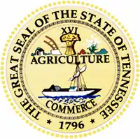 Tennessee's current state seal, adopted in 1987, is a modernized version of the seal originally designed in 1801. The seal features the words "Agriculture" and "Commerce" and the date of the state's founding. The number 16 appears as a Roman numeral, signifying that Tennessee was the 16th U.S. state. The theme of Agriculture is illustrated by images of a plow, a bundle of wheat, and a cotton plant, while the theme of Commerce is illustrated by an image of a riverboat.[1] |