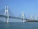 ![]() | 38 | Ōshima Bridge (Nagasaki) | 大島大橋 | 350 m (1,150 ft) | 1,095 m (3,593 ft) | Cable-stayed Steel box girder deck, steel pylons | Nagasaki prefectural road No. 52 Yobukonoseto Strait | 1999 | Saikai - Oshima Island 33°02′15.2″N 129°38′30.7″E | Nagasaki | [S 52] |